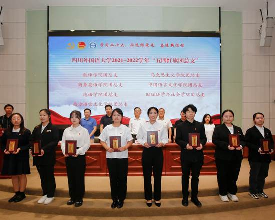 5月4日下午,2023年四川外国语大学五四青年表彰大会在东区宏文楼国际报告厅举行,我院团总支荣获2021—2022学年“五四红旗团总支”,2020级3班团支部、2021年2班团支部荣获“五四红旗团支部”称号,成依果同学荣获“红岩十佳青年”,蹇佳桧、黄睿娴等8名同学荣获“优秀共青团干部”,高嘉馨、吴科颖等8名同学荣获“优秀共青团员”称号。
