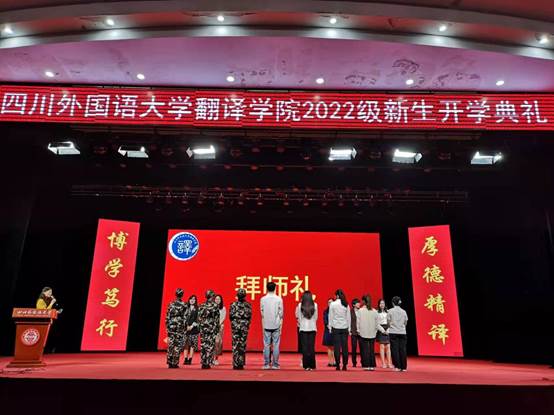 在学院传统环节拜师礼仪式上,主席台上的教师代表接过同学们敬献的香茶,同时为同学们佩戴上院徽,台下全体新同学也为自己戴上了院徽,从此正式成为“翻译人”。