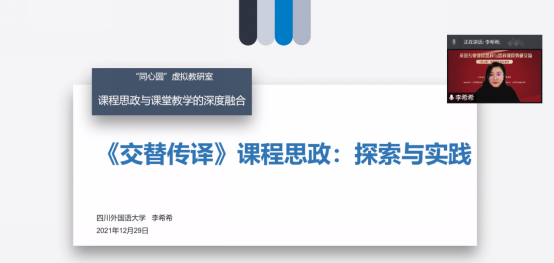 为全面推进课程思政教学体系建设,切实提升“三进”实效,践行新时代外语教育立德树人的初心与使命,12月29日下午,北京外国语大学与外研社外研在线,依托外研社·U讲堂社区成功举办了秋季学期第4期“同心圆”课程思政虚拟教研活动。我院教师李希希受邀参加并进行了课程分享。
