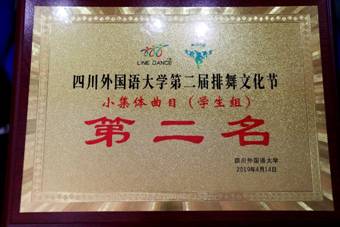2019年4月14日晚,由我院2018级同学为主力的学生代表参加了2019年四川外国语大学第二届排舞排舞文化节。我院学生凭借优美娴熟的表演,惊艳了在场的评委和观众,在小集体组规定曲目《真正的灵感》比赛中斩获第二名,原创曲目组《童年的回忆》比赛中荣获第七名。