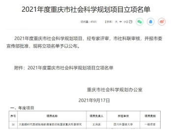 近日,重庆市社会科学规划办公室公布了2021年度重庆市社会科学规划项目立项名单,我院王洪波博士申报的《大数据时代西部陆海新通道目的地国家重庆形象研究》荣获一般项目立项。该项目依托建设中的重庆国际形象传播大数据中心,利用中心的跨语言大数据平台,以西部陆海新通道目的地国家的重庆形象为主要研究对象,服务重庆西部陆海新通道建设,将为提升重庆国际化形象和国际合作水平提供智力支持。