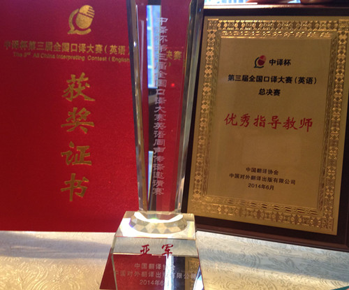 2014年6月7日,中译杯第三届全国口译大赛同传邀请赛在北京第二外国语学院圆满落幕,我院MTI研究生李佳颖在比赛中荣获亚军。此次同声传译邀请赛共有40余名参赛选手,分别来自南京大学、中山大学、外交学院、四川大学、武汉大学、对外经济贸易大学、北京外国语大学、广东外语外贸大学、北京语言大学、四川外国语大学、北京第二外国语学院、澳门大学、香港理工大学等20多所知名院校。