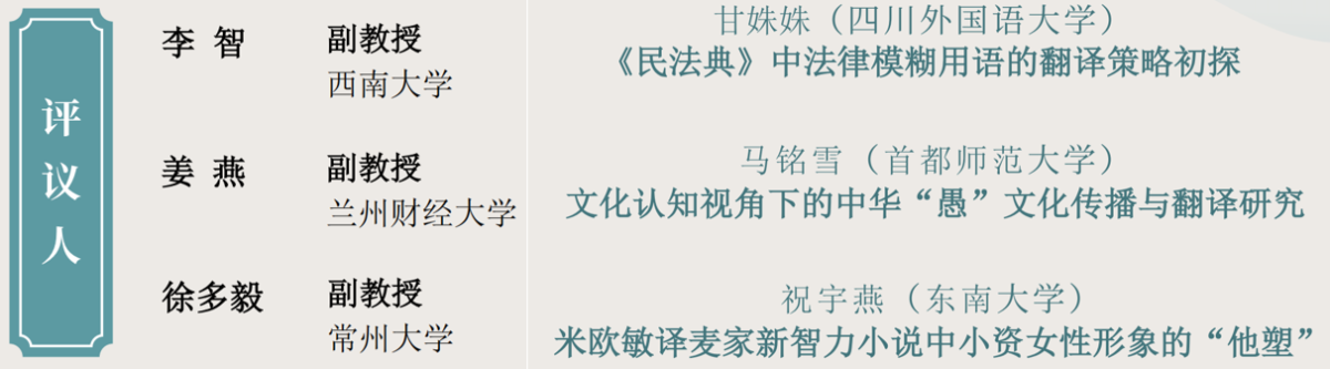 第一位主讲人甘姝姝,来自太阳成集团tyc33455,太阳成集团官方网站,研究方向为法律外交翻译;第二位主讲人马铭雪,来自首都师范大学,研究方向为翻译与国际传播;第三位主讲人祝宇燕,来自东南大学外国语学院,主要从事文学翻译。