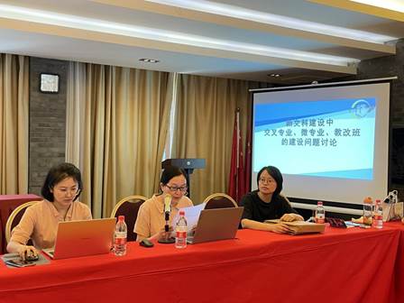 新文科建设中交叉专业、微专业、教改班的建设问题讨论环节,李海峰老师的发言对传统的纯文学语言课程内容进行了反思,以商务英语、经贸英语术语翻译为例指出交叉专业教材内容的全面性、时效性等值得改进,并提出了自己的学术研究新方向。黄雪蓉老师作了教改班情况汇报。设立2021级本科翻译卓越人才教改班“傅雷班”是学院新文科建设的新举措之一,旨在培养创新能力强、适应社会文化产业发展需求、具有较强口笔译高素质语言服务人才。此次通过选拔考试的方式,30名同学成功入选“傅雷班”,并已顺利完成了本学期学习计划。
