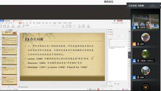 讲座之后,大家就相关问题进行了积极的讨论和交流。李金树教授认为两所大学博士生代表此次的发言代表了两种不同的研究传统与路径,两校未来还可以加强进一步的合作与交流,以实现优势互补。胡显耀教授对刘黎的研究进行点评,认为论文框架清楚,文本细读的方式开展翻译史研究值得推荐,并对该话题的进一步深入探讨提出建议。廖七一教授对刘艳春的研究进行了点评,肯定语料库翻译研究的价值,认为语料库方法可以解释传统翻译研究方法无法解释的现象,但也指出研究翻译共性的同时,需要对翻译的复杂性进行深入探讨。此次线上论坛为西南大学和四川外国语大学两校的师生交流搭建一个良好的互动平台,沟通了不同的翻译学研究方法与路径,对推动两校的翻译学科建设和翻译人才培养具有积极的意义。