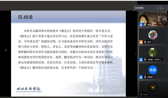 12月10日晚,四川外国语大学“巴别译谭”第四讲在线上成功举办。本次论坛联合西南大学外国语学院通过腾讯会议举行。来自两校的翻译学博士研究生刘艳春和刘黎分别以“翻译共性的解释路径与理论模型刍议”和“翻译批评与译作功能:析〈乾隆英使觐见记〉之旧译今用”为题做了精彩分享。西南大学胡显耀教授、四川外国语大学廖七一教授、李金树教授受邀出席,并做精彩点评。两所大学翻译学方向的教师和硕博研究生积极参与了本次活动。