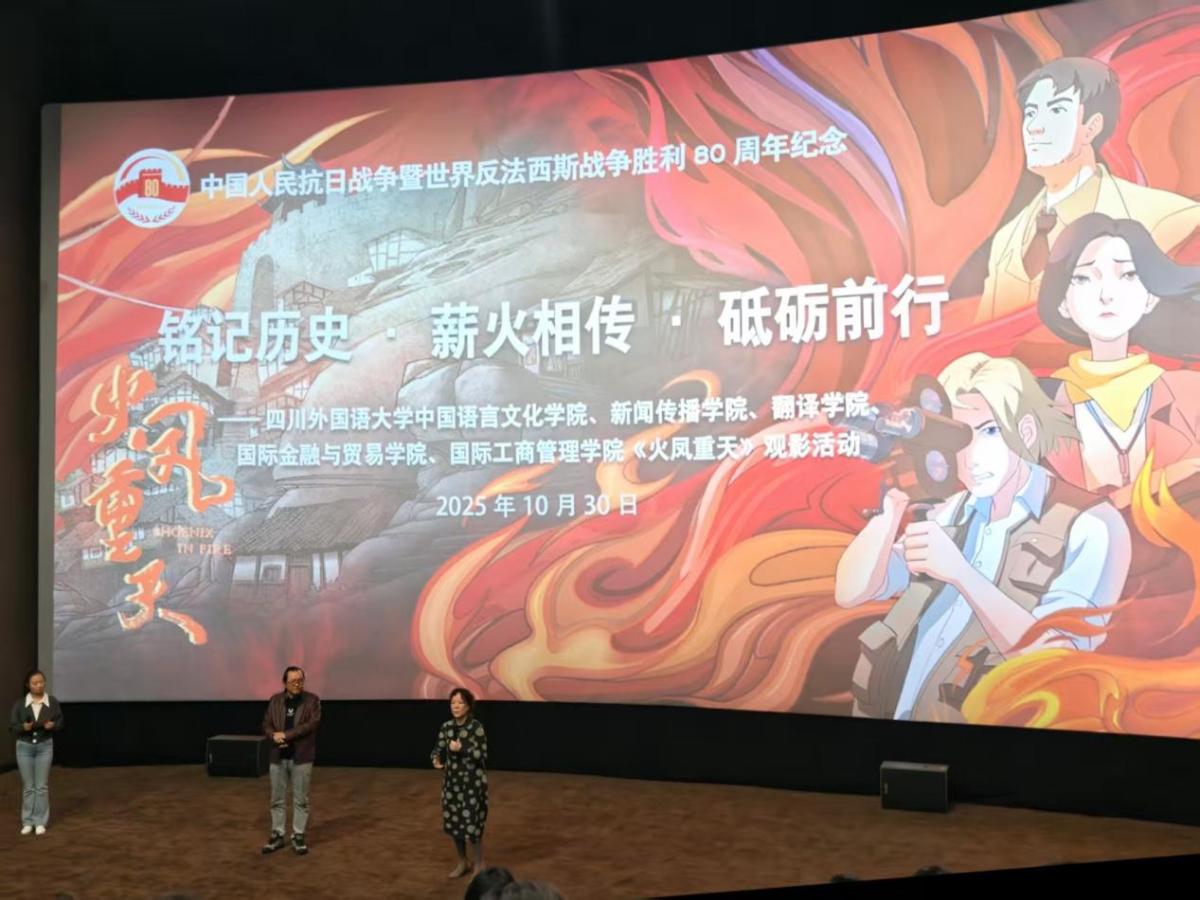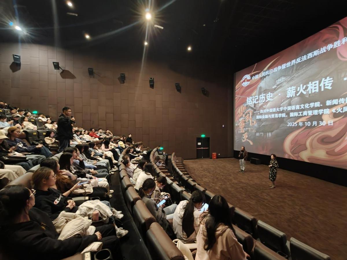 为深化党史学习教育,传承伟大抗战精神,强化党员使命担当,10月30日下午,学院本科生、研究生学生支部与中国语言文化学院、国际金融与贸易学院、国际工商管理学院以及新闻传播学院学生支部联合开展“铭记历史·薪火相传·砥砺前行”结对共建活动,组织党员、入党积极分子观看了重庆市纪念中国人民抗日战争暨世界反法西斯战争胜利80周年的主题电影《火凤重天》。