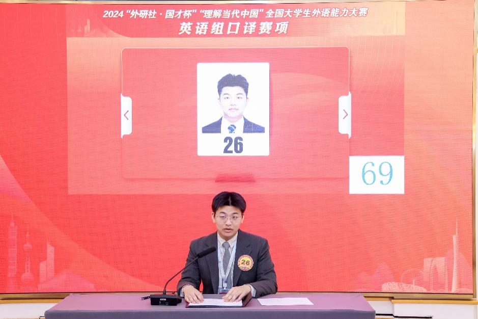 2024年12月6日至7日,2024“外研社·国才杯”“理解当代中国”全国大学生外语能大赛英语组口译赛项在北京举行。来自全国各高校的197名选手经过初赛、复赛激烈角逐,共10名选手晋级最后决赛。在决赛中,我院本科2021级同学李林晟、研究生2023级同学宋男杰凭借出色表现,荣获大赛银奖,为学院再添荣耀。