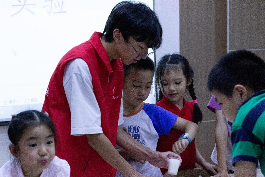 随后,小组成员陈相志为孩子们带来了精彩的化学实验。实验过程中,孩子们专心致志,仔细听讲,展现出来极高的兴趣。