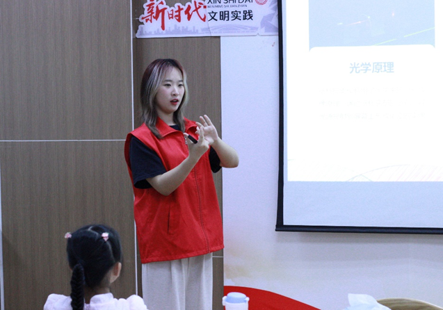 实践环节,小组成员方圆带领孩子们进行了趣味的“纸杯投影仪”小实验,让孩子们自己动手制作一个小型投影仪,之后向孩子们讲解了其中蕴含的物理知识。