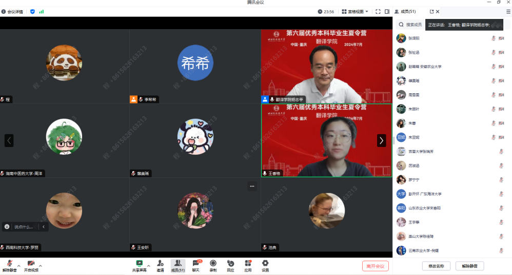 7月11日下午15:00,本次夏令营圆满完成各项活动后落下帷幕。李希希老师在总结中,鼓励营员在翻译专业的道路上理清发展思路,坚定专业理想。本次夏令营通过营员的个人风采展示和专家评议,最终评选出54名优秀营员。上海对外经贸大学王香格同学作为优秀营员代表,分享了参加本次夏令营的收获和感悟。