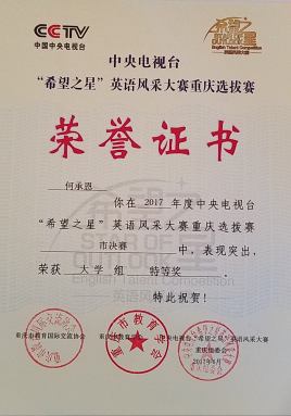 5月20日,2017年中央电视台“希望之星”英语风采大赛——重庆赛区决赛在重庆市两路口文化宫举行。此项赛事自2000年创办以来在国内外广受关注,是全国参赛人数最多、规模最大、水平最高的英语演讲赛事之一。我校太阳成集团tyc334552014级本科学生何承恩代表学校参加本年度地区赛并荣获特等奖。