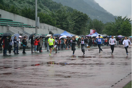 田径比赛中,参加100米短跑的运动员在做着紧张的热身运动,即使风雨依旧狂啸,跑道布满水洼,我们的运动健儿们依旧咬牙向前。参加女子800米的同学在起跑线上目光坚定地望向前方。随后的男子1000米比赛极其考验耐力,可健儿们无所畏惧。在同学们的加油鼓劲中,他们风雨无阻,只顾向着终点奔跑。
