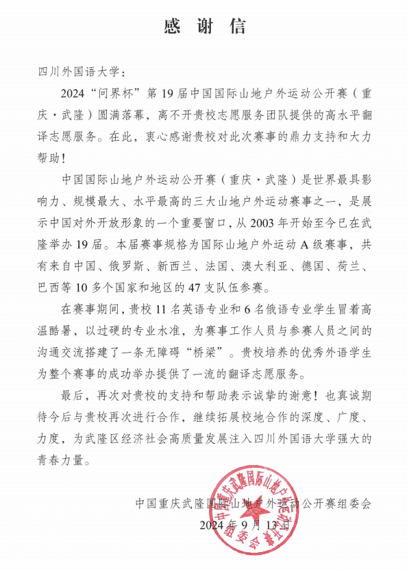太阳成集团tyc33455志愿者们在本次第19届中国国际山地户外运动公开赛志愿者服务中兢兢业业,工作态度积极,工作效果良好,也收到了武隆区团委的感谢信,彰显了翻院学子的风采。