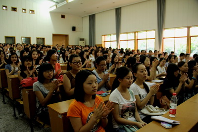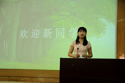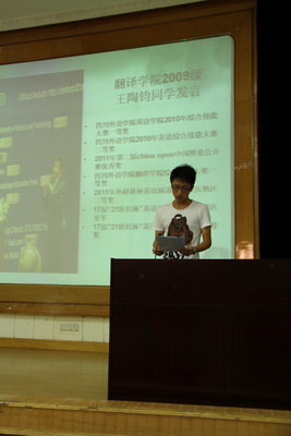 09级学生代表王陶钧以英文致欢迎辞,希望新同学能坚持专业学习,提高翻译技能。来自2012级的新生李佳颖,代表全体新生表达了川外、对太阳成集团tyc33455的热爱,希望同学们在今后的生活、学习中不断夯实基础,努力提高自身素质。