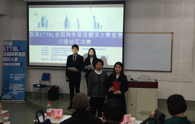 2016年1月9日,由全国商务英语翻译考试办公室和全国商务英语翻译专业委员会主办、四川外国语大学商务英语学院承办的首届ETTBL全国商务英语翻译大赛川渝赛区决赛在我校宏文楼举行。我院2014级MTI研究生贾代春同学参加了此次比赛,并荣获一等奖。