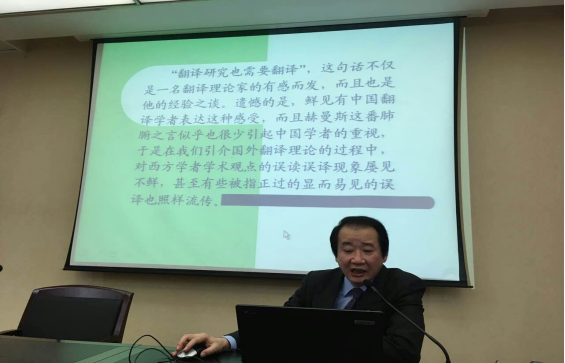 曹明伦教授以“翻译研究也需要翻译”为题做了精彩报告。讲座主要探讨了西方翻译理论引介过程中的误读误译问题。曹明伦教授首先介绍了一些自己的译著,并以此引出亲身实践的一些经历,鼓励大家积极且踏实地做学问。紧接着,曹明伦教授以“翻译暴力”一词,以色列学者Gideon Toury为“Translation”下的“定义”以及将Derrida的“trace”译成“踪迹”、“痕迹”、“印记”和把“redeem”译为“救赎”为例,指出翻译研究中的误译炮制了许多“无中生有”的概念,从而使人误以为西方译论晦涩难懂,为我国的翻译理论研究造成了一定的负面影响。