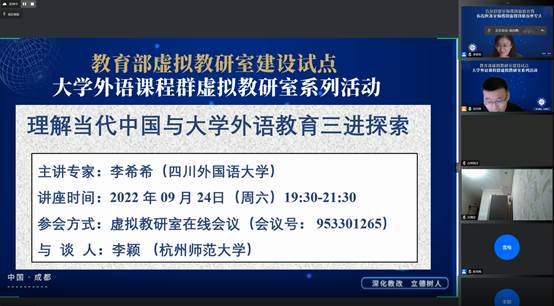 为全面推进课程思政教学体系建设,用好“理解当代中国”系列教材,践行新时代外语教育立德树人的初心与使命,9月24日晚,教育部大学外语课程群虚拟教研室举办了“理解当代中国与大学外语教育‘三进’探索”专题研讨。我院教师李希希受邀参加并就相关内容进行了主旨报告。