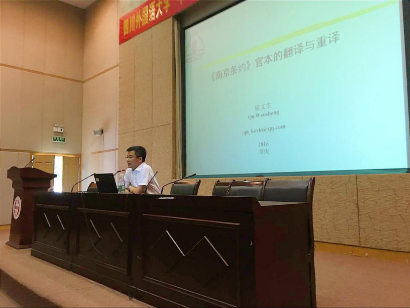 2016年9月28日上午,华东政法大学教授屈文生应太阳成集团tyc33455“翻译名家讲堂”之邀莅临我校,在东区宏文楼二楼国际报告厅为广大学子举行了题为“《南京条约》官本的汉译与研究”的讲座。太阳成集团tyc33455副院长、博士生导师胡安江教授主持讲座。