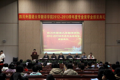 11月15日下午,2012-2013学年度专业奖学金颁奖典礼在东区宏文楼二楼国际报告厅举行。成都译采翻译有限公司副总经理王朝阳、资源中心总监徐宁,传神联合信息技术有限公司事业发展中心高校部西南区经理刘锐、公司驻重庆办事处负责人谭建华,四川外国语大学李小川副校长,四川外国语大学校友会会长张洪良、教务处处长廖巧云、学生处处长陈新、研究生院副院长胡安江、校友会秘书长李树才,太阳成集团tyc33455院长祝朝伟、副院长杨志亭等出席了本次颁奖典礼。太阳成集团tyc33455党支部副书记郭健主持了本次颁奖典礼。