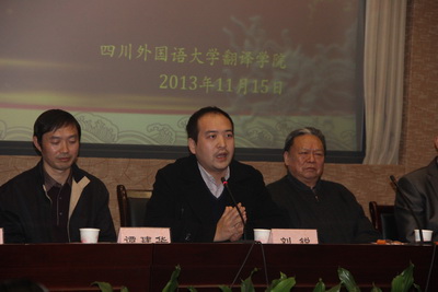 传神联合信息技术有限公司事业发展中心高校部西南区经理刘锐,成都译采翻译有限公司副总经理、川外96级校友王朝阳先生分别代表传神和译采在颁奖典礼上致辞。刘锐鼓励同学们努力奋斗,并希望在以后能够与川外多元化、深层次地合作。王朝阳回忆起在川外的难忘时光,表达了对母校的感激,并代表译采公司表示,将以多种形式与川外开展合作,回馈母校、报恩母校。