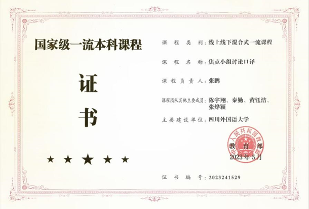 张鹏教授负责的课程《焦点小组讨论口译》获批国家级一流本科课程。学院新增重庆市课程思政示范课程1门,重庆市一流本科课程1门、重庆市社会实践类一流本科课程1门,新增校级课程思政示范课程1门。