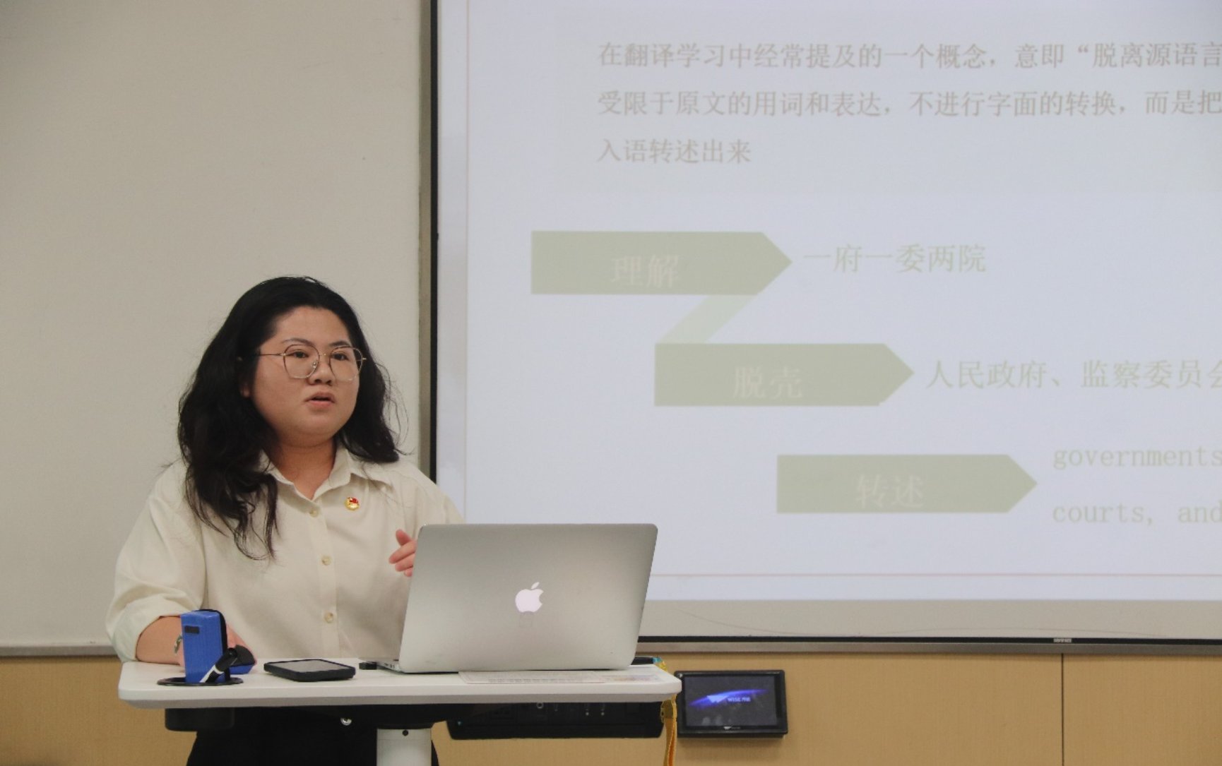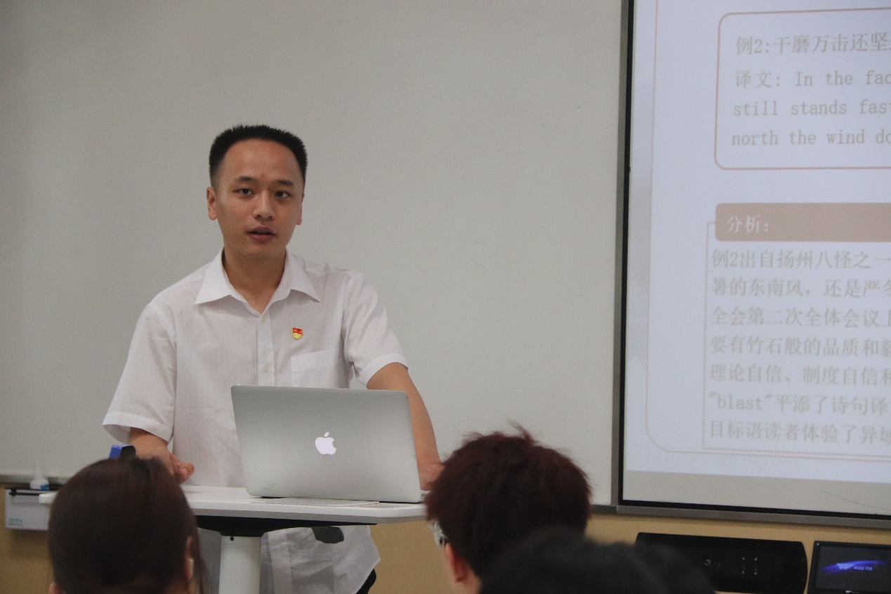 23级笔译3班的孙婷同学就《习近平谈治国理政》翻译中的脱壳研究为题进行了分享。强调翻译过程中要运用翻译专业知识,从显化译法、弱化译法、信息重组译法入手,做好文本翻译工作。