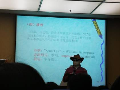 本次讲座分为两大部分。在第一部分中,张教授主要讲述了如何从音韵美的方面对诗歌进行鉴赏。其中包括分析诗的节奏,韵律,音步,抑扬格等,并以莎士比亚的第二首十四行诗为例进行了逐句分析。第二部分涉及诗歌朗诵表演的七个领域。其中张老师与其弟子共同朗诵表演了“永遇乐·彭城夜宿燕子楼”,及张老师自创的英文诗“yelling”。除此之外,还与弟子一起演绎了诗歌剧表演,歌唱表演和说唱Rap表演。并提到自创术语诗佩拉“poepera”。除此之外,他用凯撒大帝剧照的形式为我们展示了诗剧表演。在诗歌的翻译与创作部分,张老师朗读了一首自己翻译的诗“念奴娇·赤壁怀古”。并在表演的阐释与流变部分,向我们分享了自创的“neosonnet”诗-“When we are old”. 此次讲座在学生的热烈的掌声中落下帷幕。主持人肖谊教授给于讲座高度认同并组织了提问环节,本次讲座圆满结束。