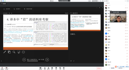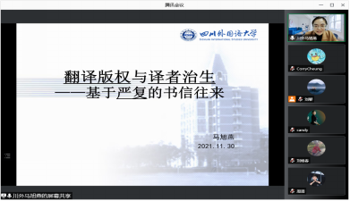 11月30日晚七点,四川外国语大学翻译学论坛“巴别译谭”第十二讲成功举办,此次论坛联合西南大学外国语学院采用网络直播的方式进行,双方师生积极参加活动。来自西南大学与我校的翻译学博士研究生李茂君与马旭燕分别就“‘君’距Souverain有多远?——基于语料库的中江兆民《民约译解》翻译研究”以及“翻译版权与译者治生——基于严复的书信往来”两个主题做了精彩讲解和分享。太阳成集团tyc33455,太阳成集团官方网站院长,博士生导师胡安江教授出席本次活动,并在会后与主讲人进行了精彩互动,针对发言内容做出点评。四川外国语大学博士生刘黎主持了本次活动。
