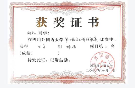 2022级4班刘钰荣获校第十届学生排球联赛,女子组第二名。