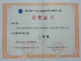 2022级英语笔译研究生郑子雯同学在第五届ETTBL全国商务英语翻译大赛中获得笔译研究生组三等奖;