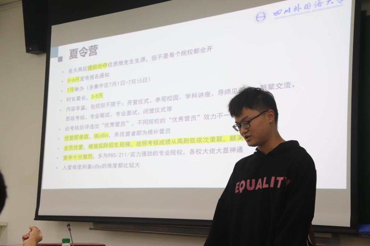 成功推免到北京外国语大学的李星雨同学首先向大家介绍了各大高校的推免考核内容,分析了不同高校的共性和个性要求。通过回顾自己的学习经历,李星雨同学强调了专业学习知识积累的重要性。并建议大家放平心态,记住“No effort goes in vain”。