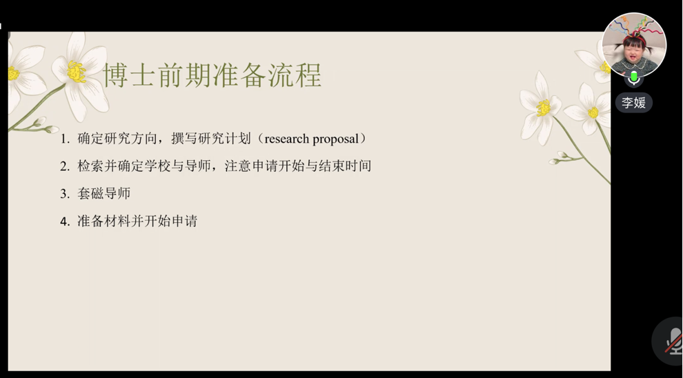 李媛校友目前是新加坡南洋理工大学的在读博士生,主要从事中国政府白皮书英译研究。本次分享主题为“从川外到南洋——求学之路中的所感、所惑与所得”,分为读研回顾、博士申请和问答三个环节。她首先回顾了三年的研究生生活,“政府实习”和“学术研究”是这段生活的关键词。李媛着重提到研一假期在重庆两江新区管委会实习的经历,认为这段经历为她未来的研究方向做了铺垫。随后,她从专业确定、备考经验、复试经验三个方面为大家分享了博士申请阶段具体细节,“要针对目标院校的要求进行有策略的准备,包括语言要求、学位证、成绩单、推荐信、简历等”。学校的层次可以从平台、就业前景和学术氛围这三个方面来选择自己心仪的大学。